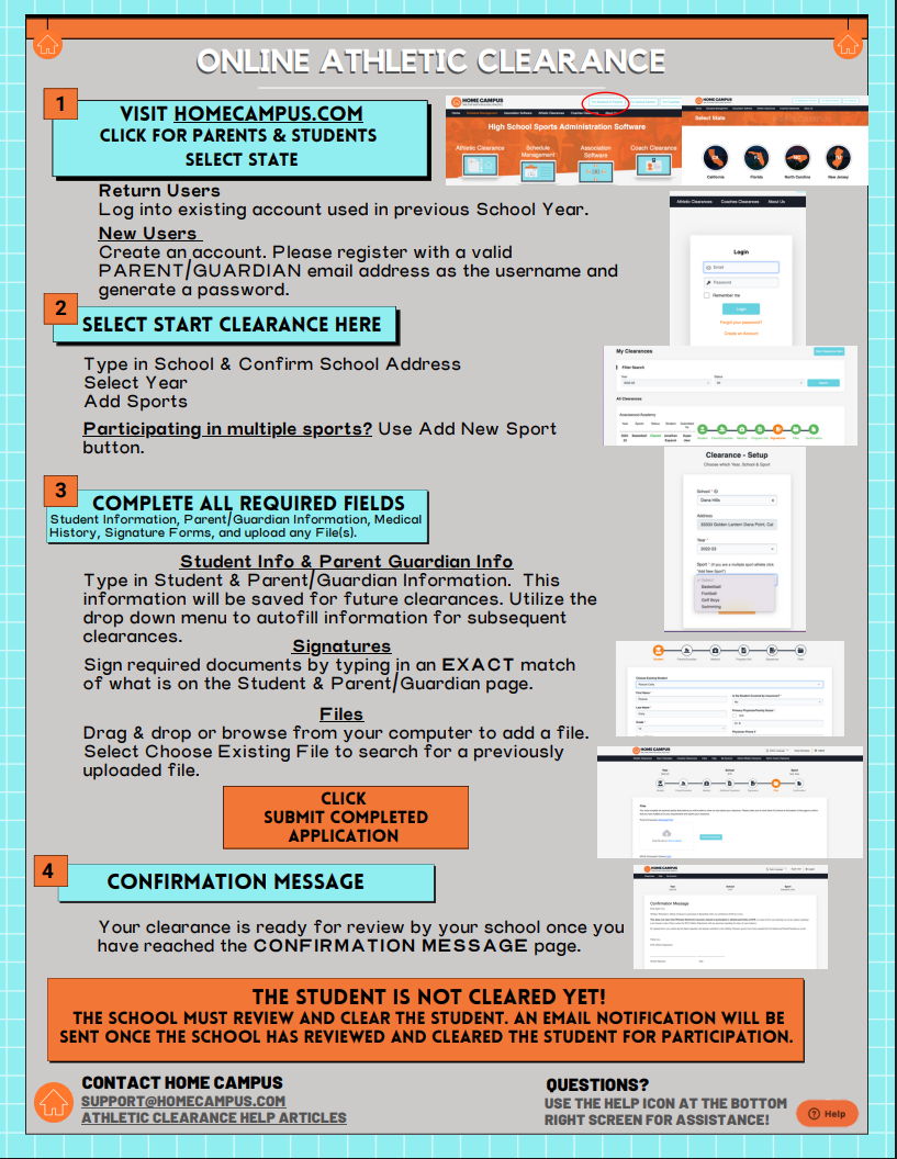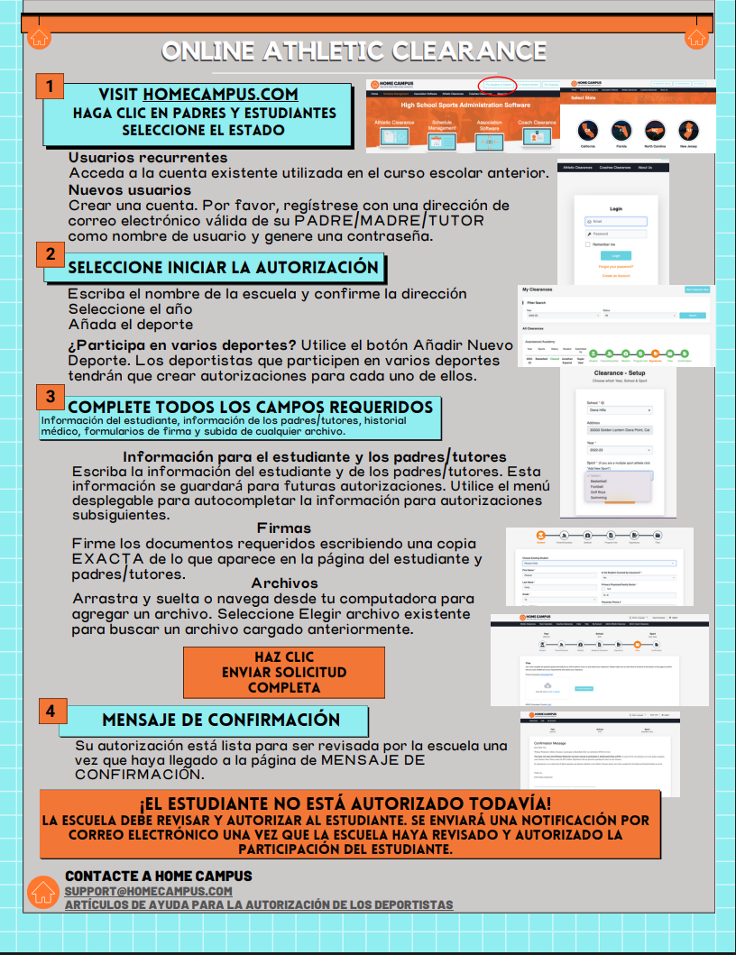 BELOW ARE SINGLE PAGE DIRECTIONS ON HOW TO GET CLEARED FOR ATHLETIC PARTICIPATION (PLEASE NOTE THAT YOU WILL NEED TO UPLOAD YOUR PROOF OF HEALTH INSURANCE ALONG WITH YOUR CURRENT PRE-PARTICIPATION PHYSICAL TO THE FILES SECTION. INSTRUCTIONS ARE AVAILABLE IN SPANISH BELOW AS WELL.